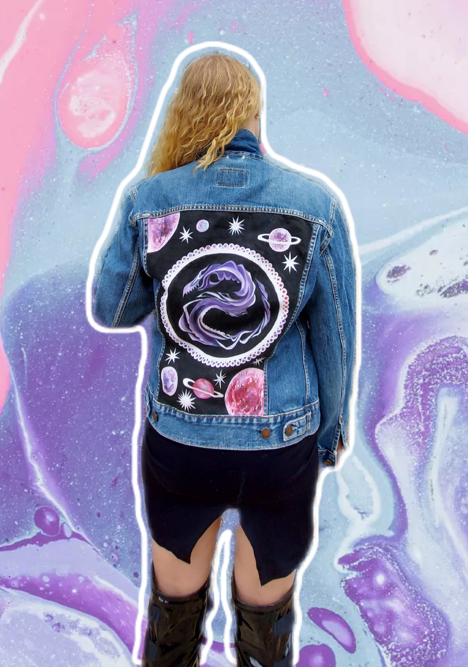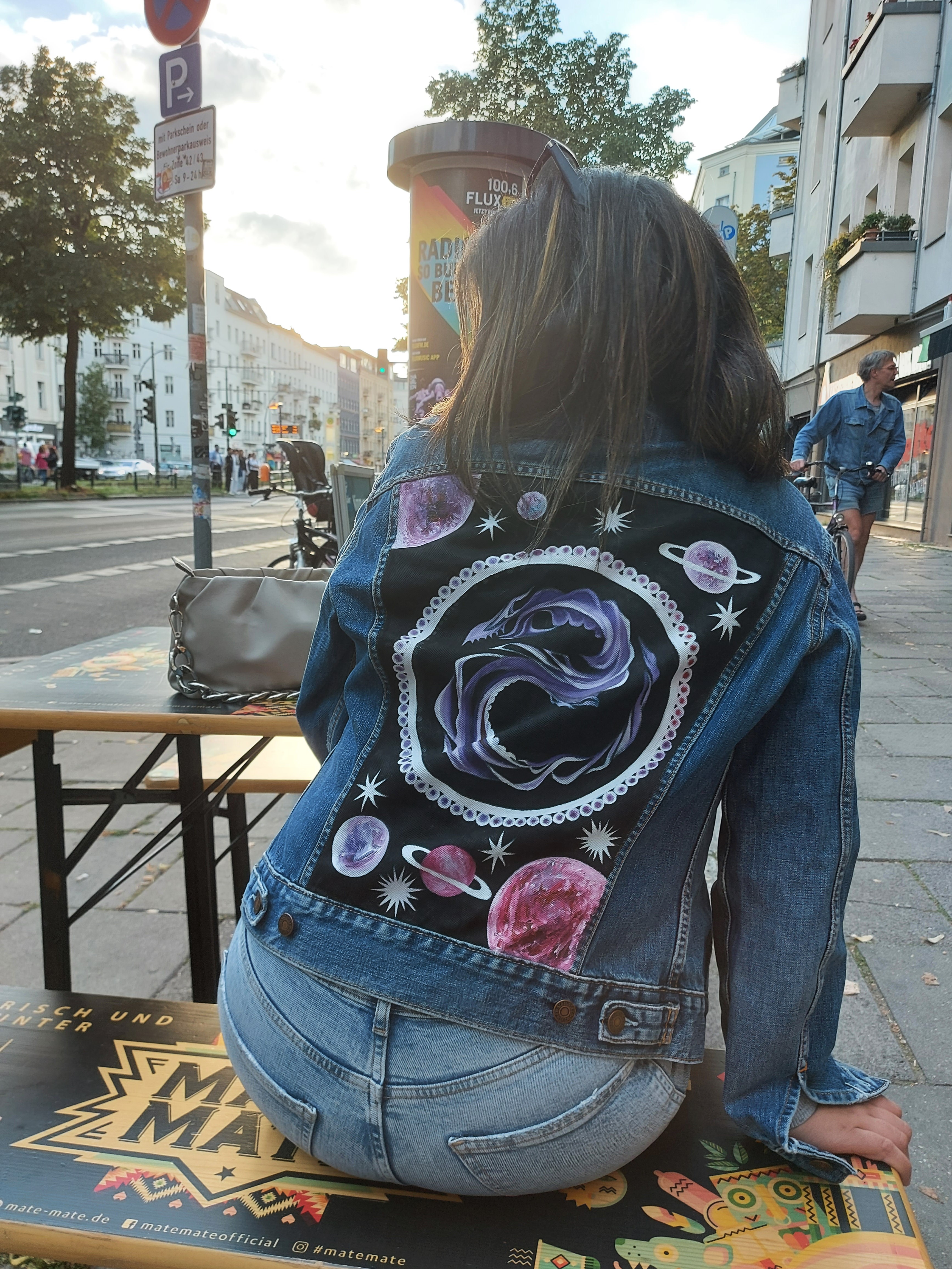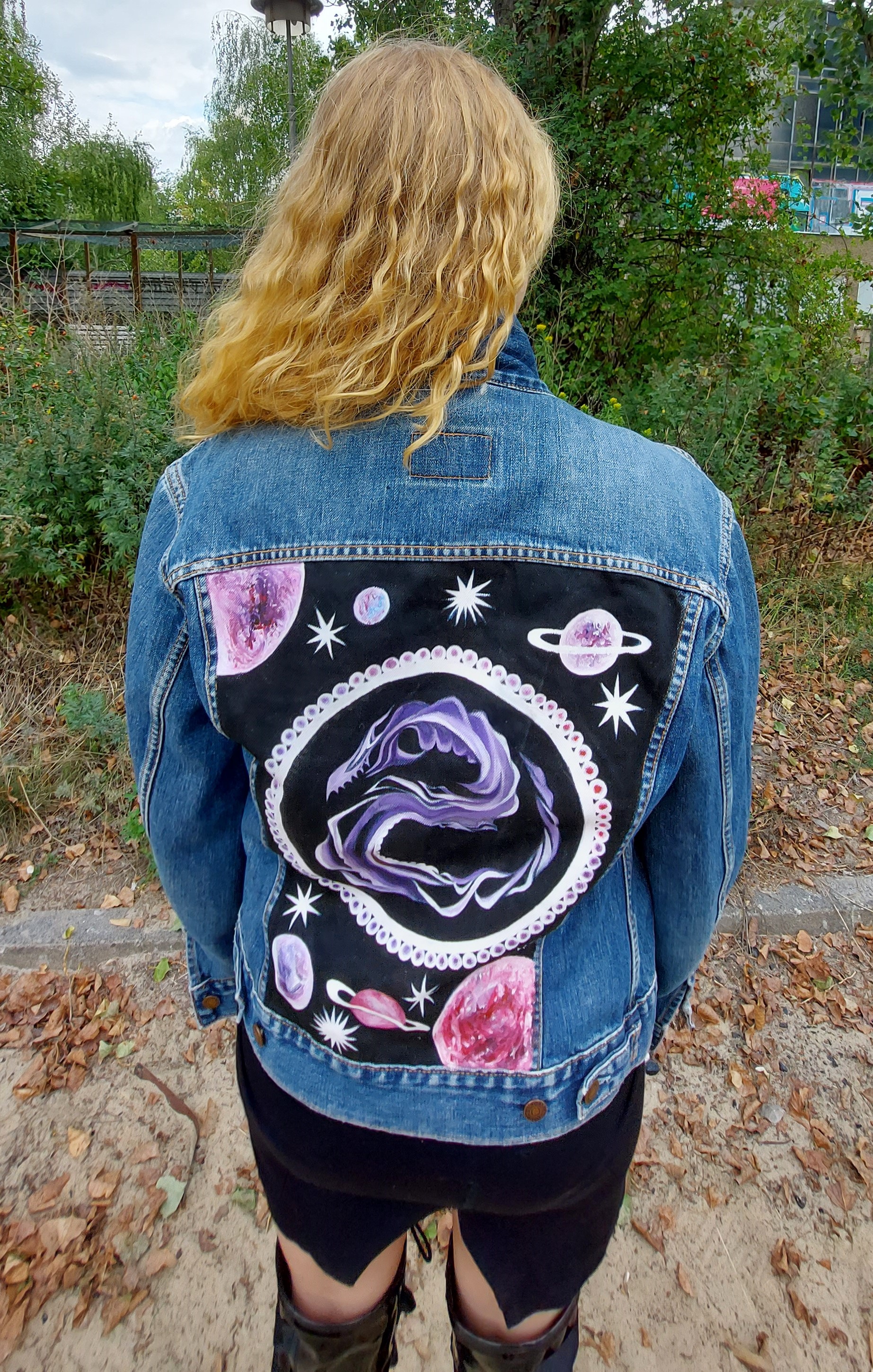 Painted with fixed permanent textile colors, on vintage jeans jacket, back is painted with original artwork that the artist came up with especially for this jacket. This jacket is the only original on earth!