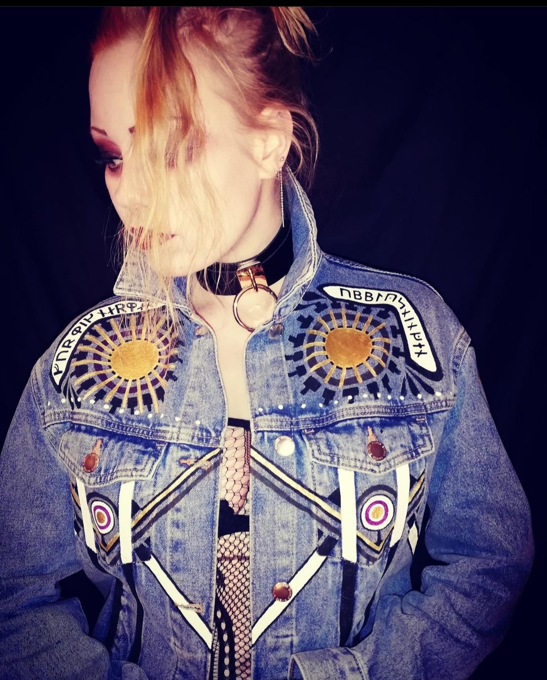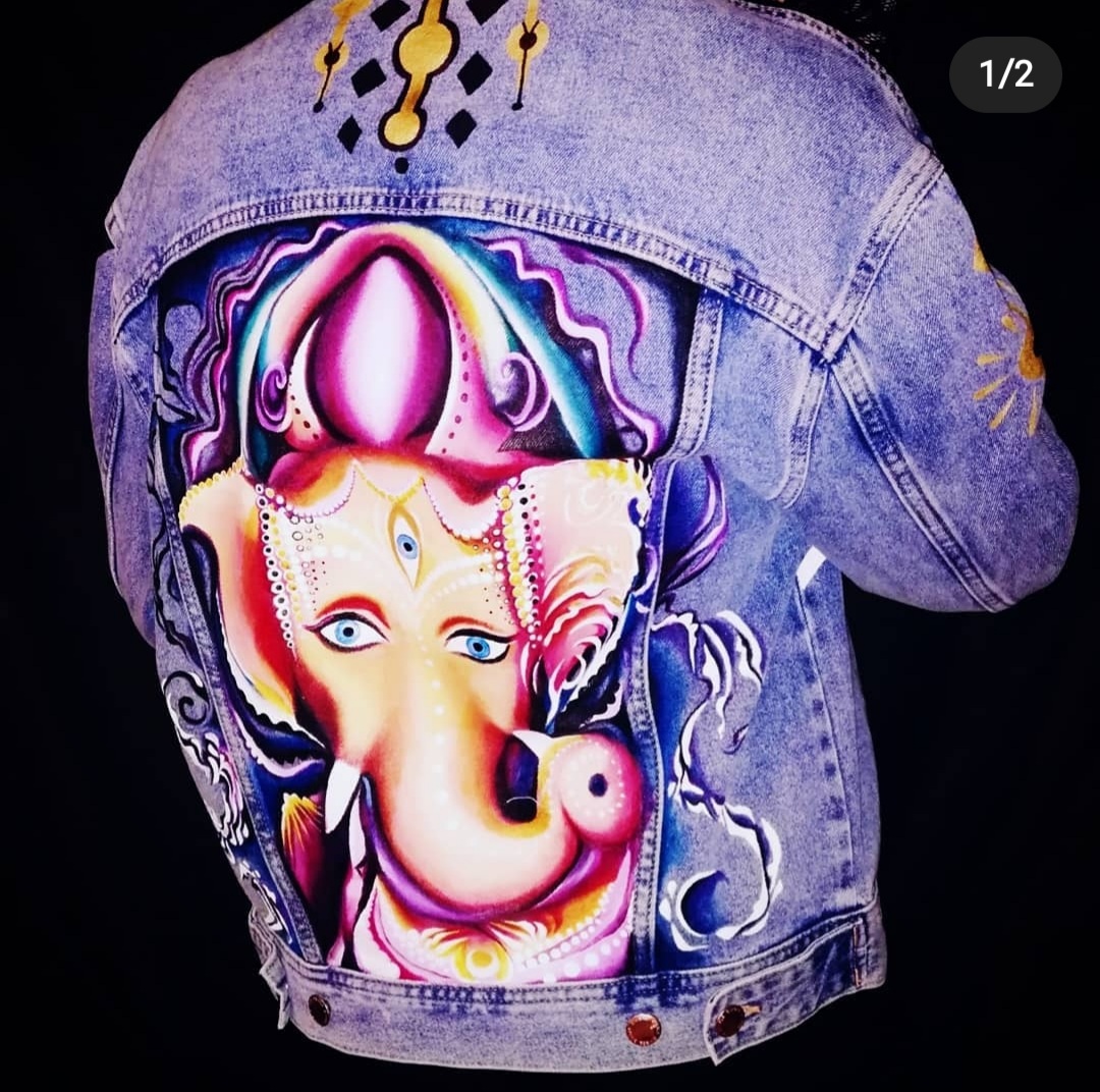 Painted with fixed permanent textile colors, on vintage jeans jacket, both back and front is painted, arms as well.