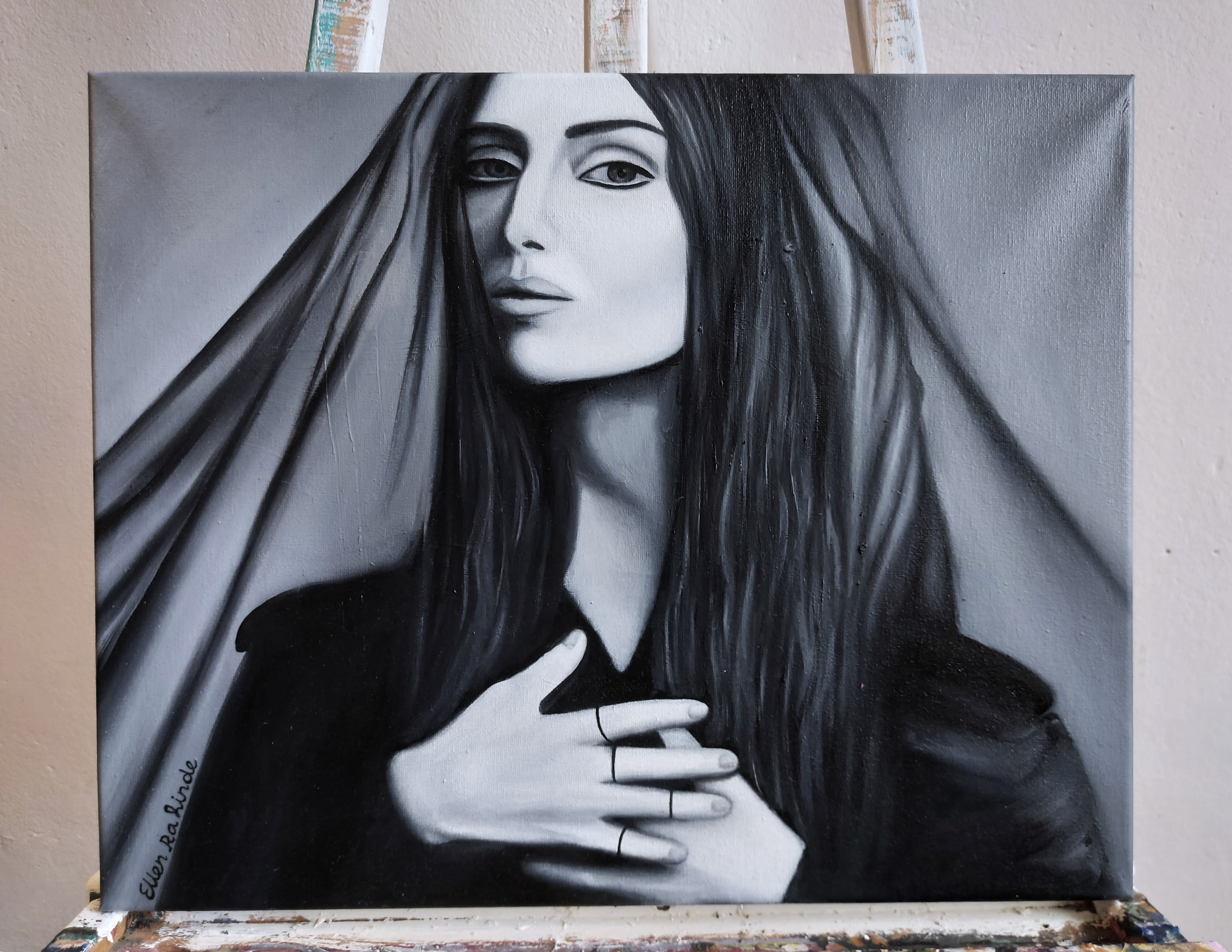 Black and white oil painting on canvas. Portrait of the internationally renowned Swedish artist Lykke Li, the portrait is re-created in Linde´s realism-fantasy style of portraits, based on the celebrated album cover for "I Never Learn" released in 2014.