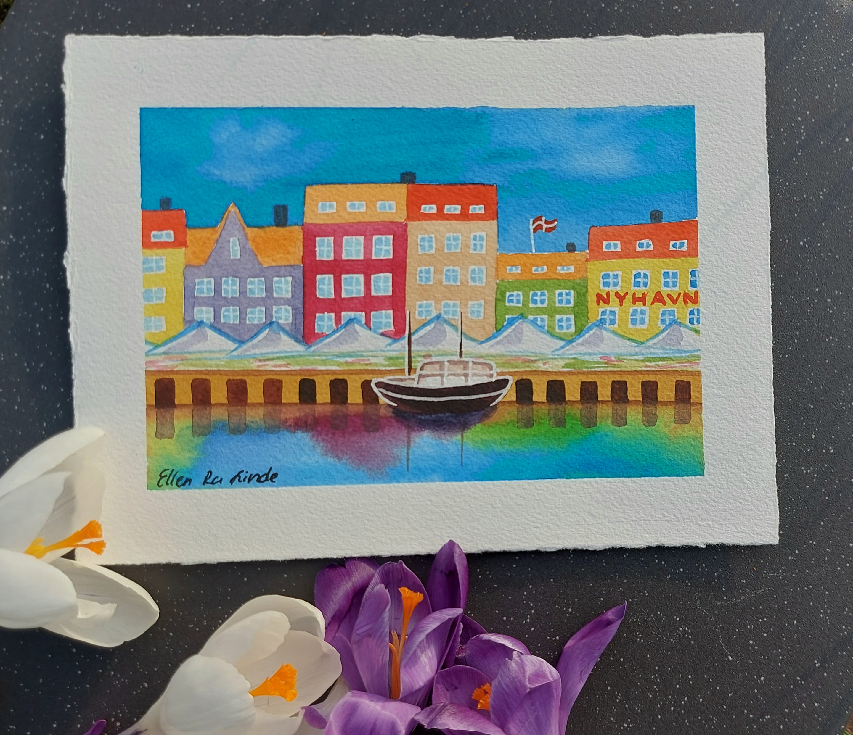 Mini watercolour drawing painted from real-life, picturing Nyhavn, København. The buildings pictured in the artwork are imitations of the real buildings there, most being over 100 years old. The lavender-coloured house to the left was the home of the famous Danish writer H.C.Andersen.