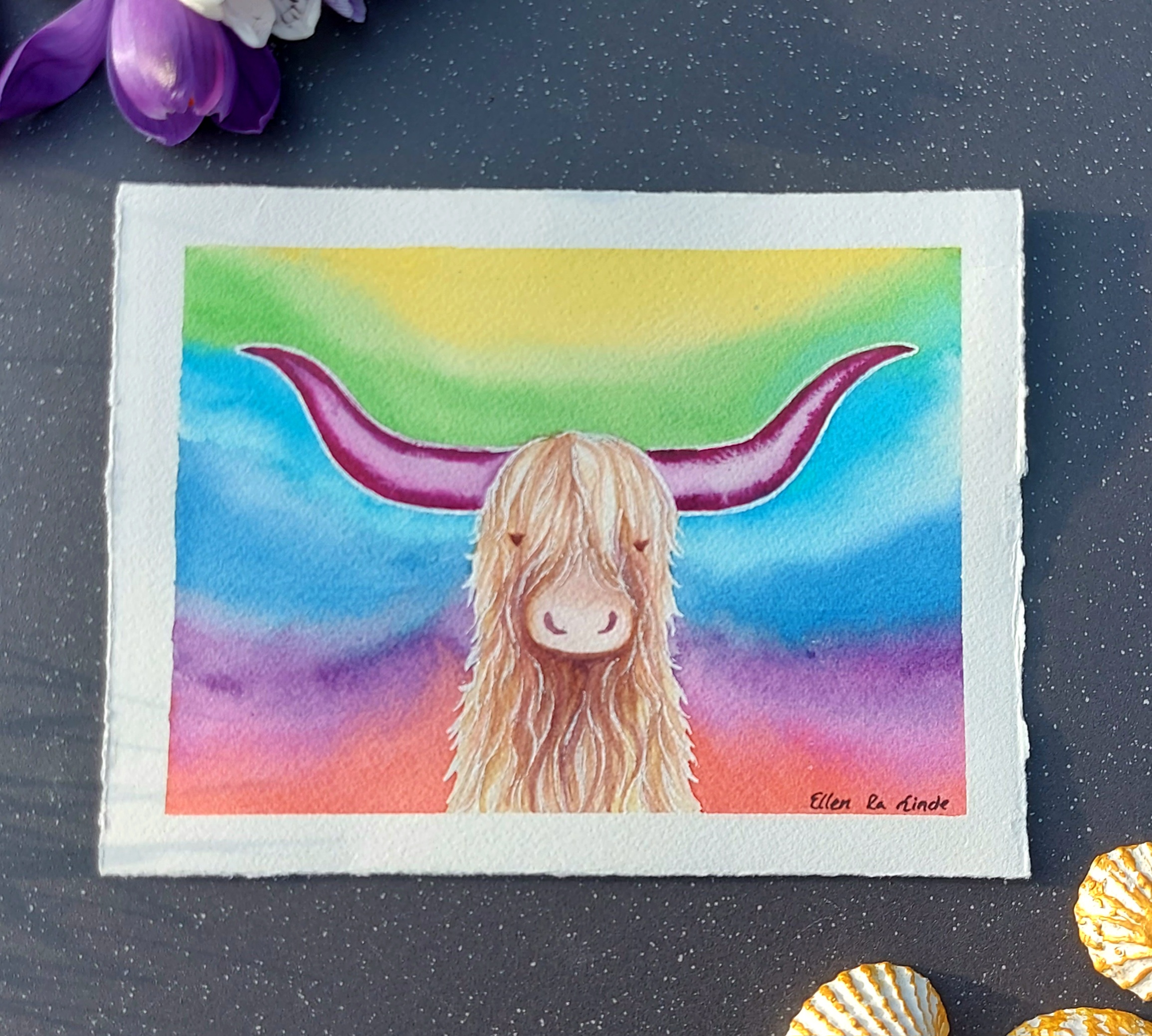 This cute little rainbow cow is a mini painting in aquarelle on fine art paper. An original artwork created by Ellen (Ra Linde) the summer of 2022, in celebration to the big Pride festival that takes place in Berlin every summer.