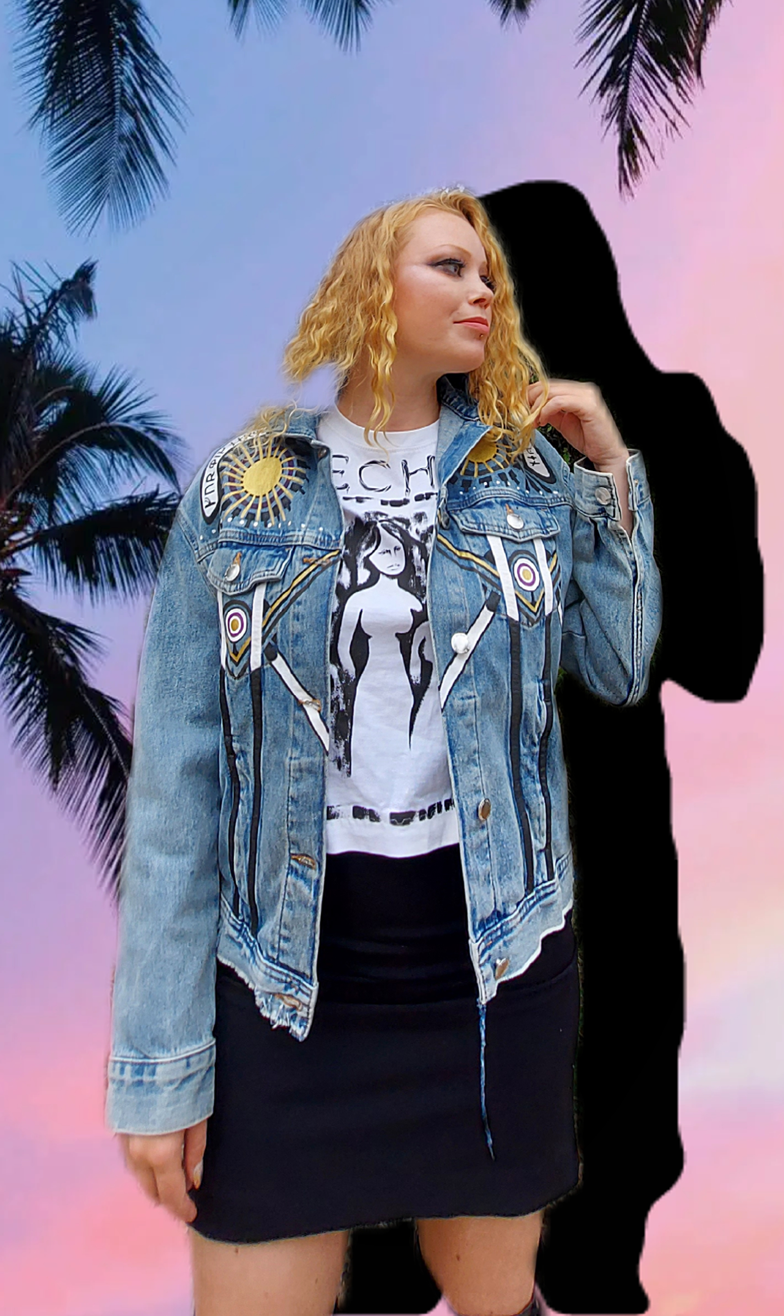 Painted with fixed permanent textile colors, on vintage jeans jacket, both back and front is painted, arms as well.