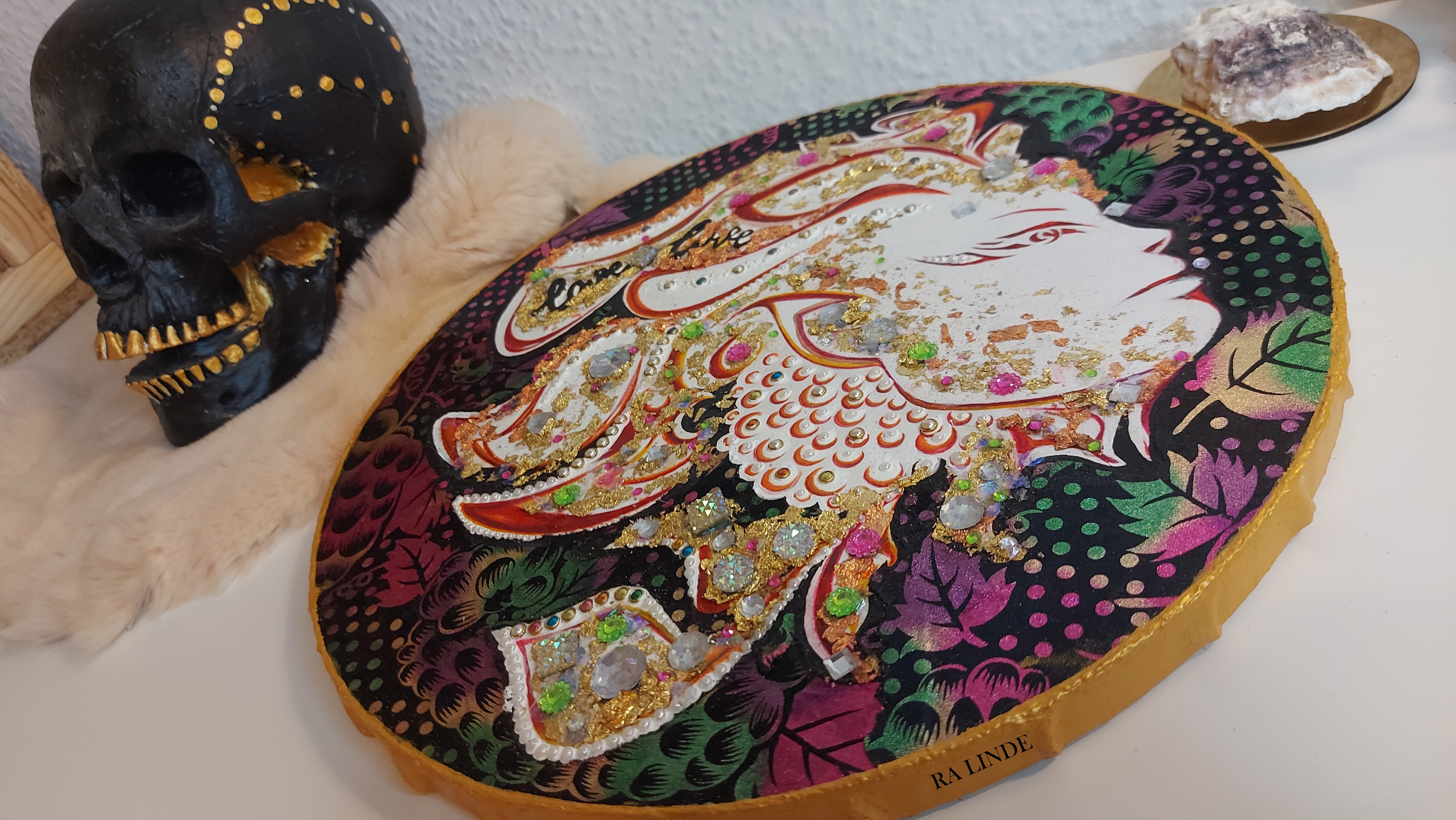 This very profile portrait is an imaginative, dreamy self-portrait by Ra Linde, which has been used as the focal motive in other artworks, differing in medium and on various materials. All are slight varying original artworks from a series of collectable artworks called "Dreamer" portraits.