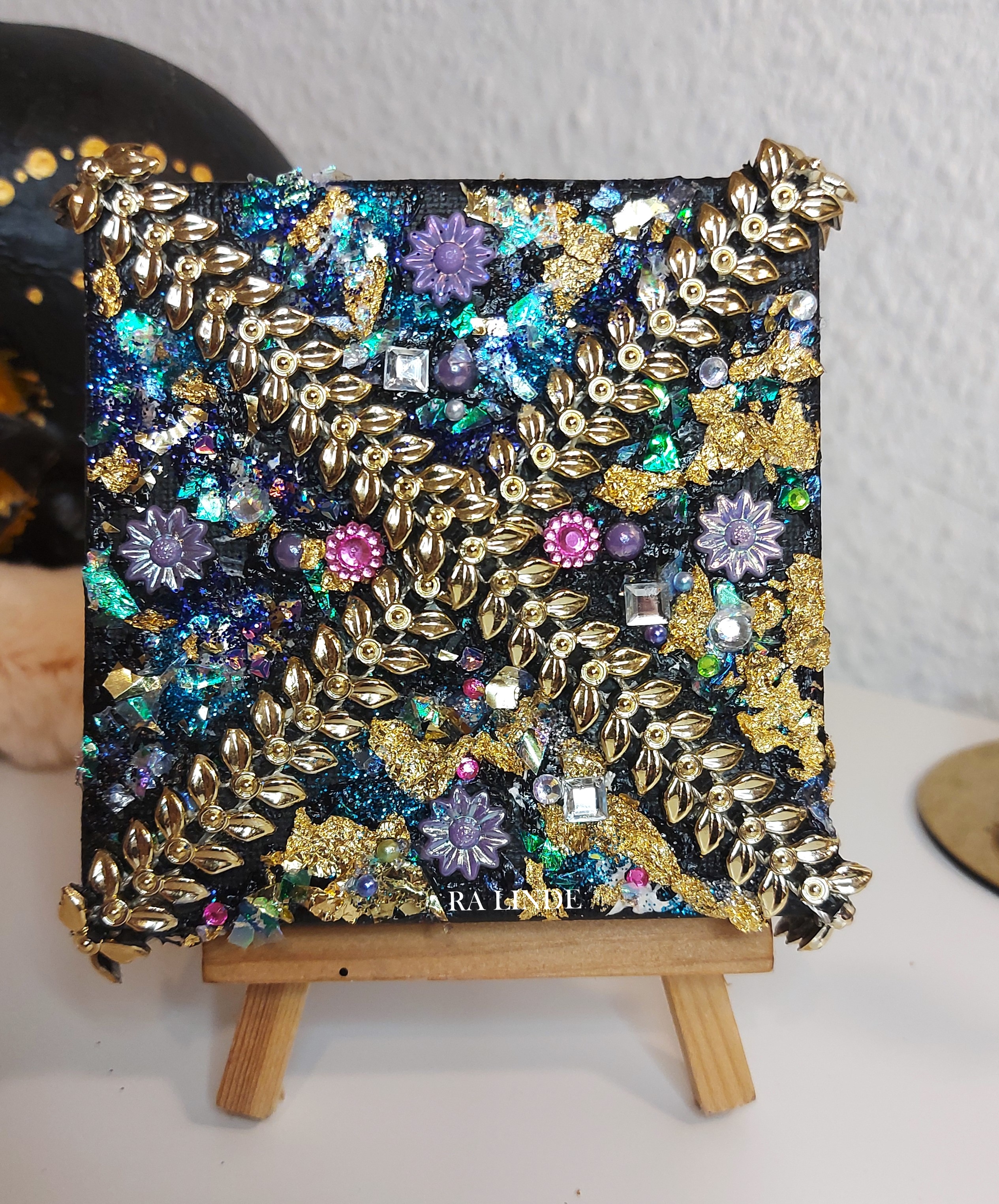 The small easel seen on the pictures, is not included in the price, artwork will be shipped by itself.