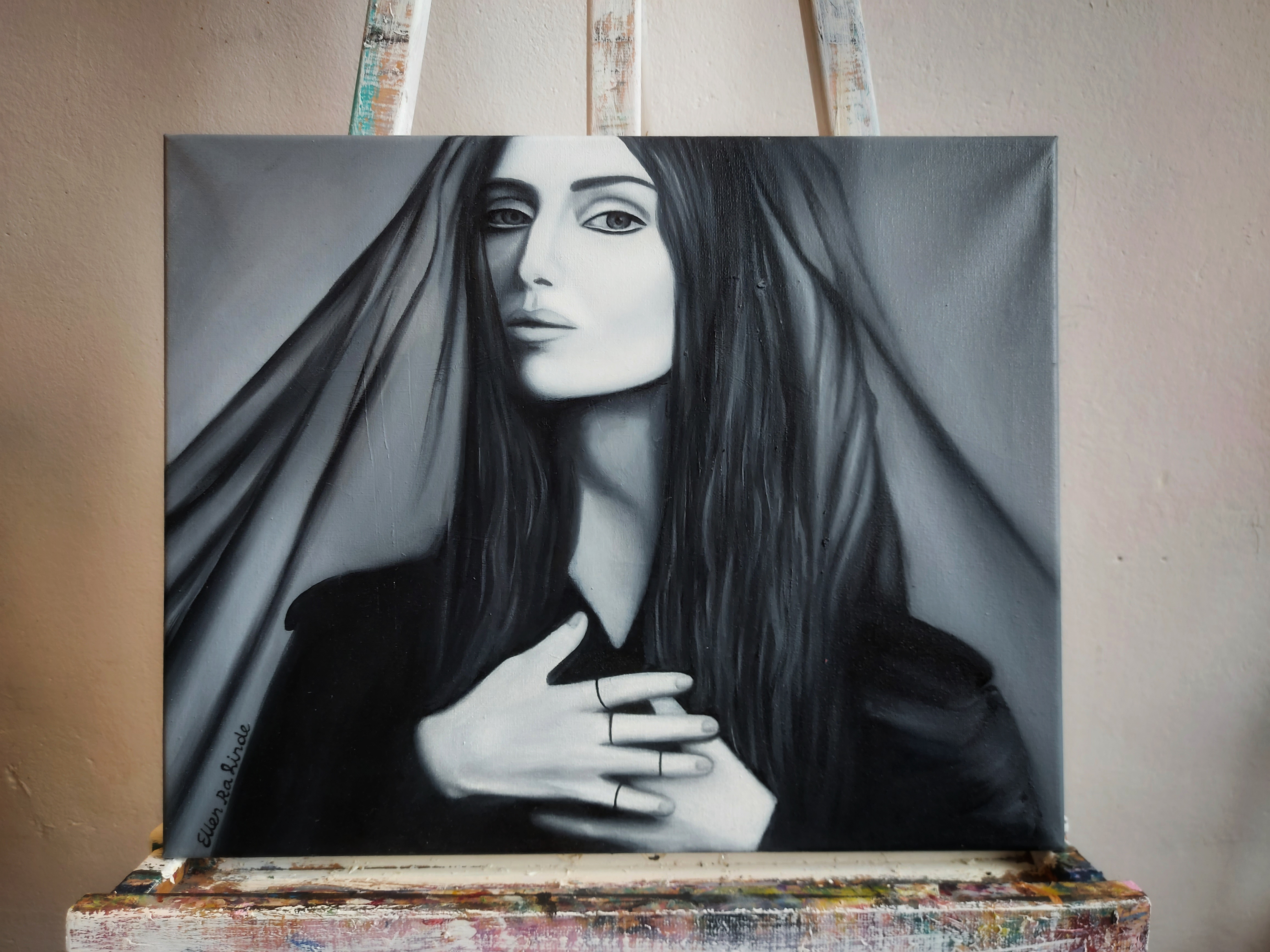 Black and white oil painting on canvas. Portrait of the internationally renowned Swedish artist Lykke Li, the portrait is re-created in Linde´s realism-fantasy style of portraits, based on the celebrated album cover for "I Never Learn" released in 2014.