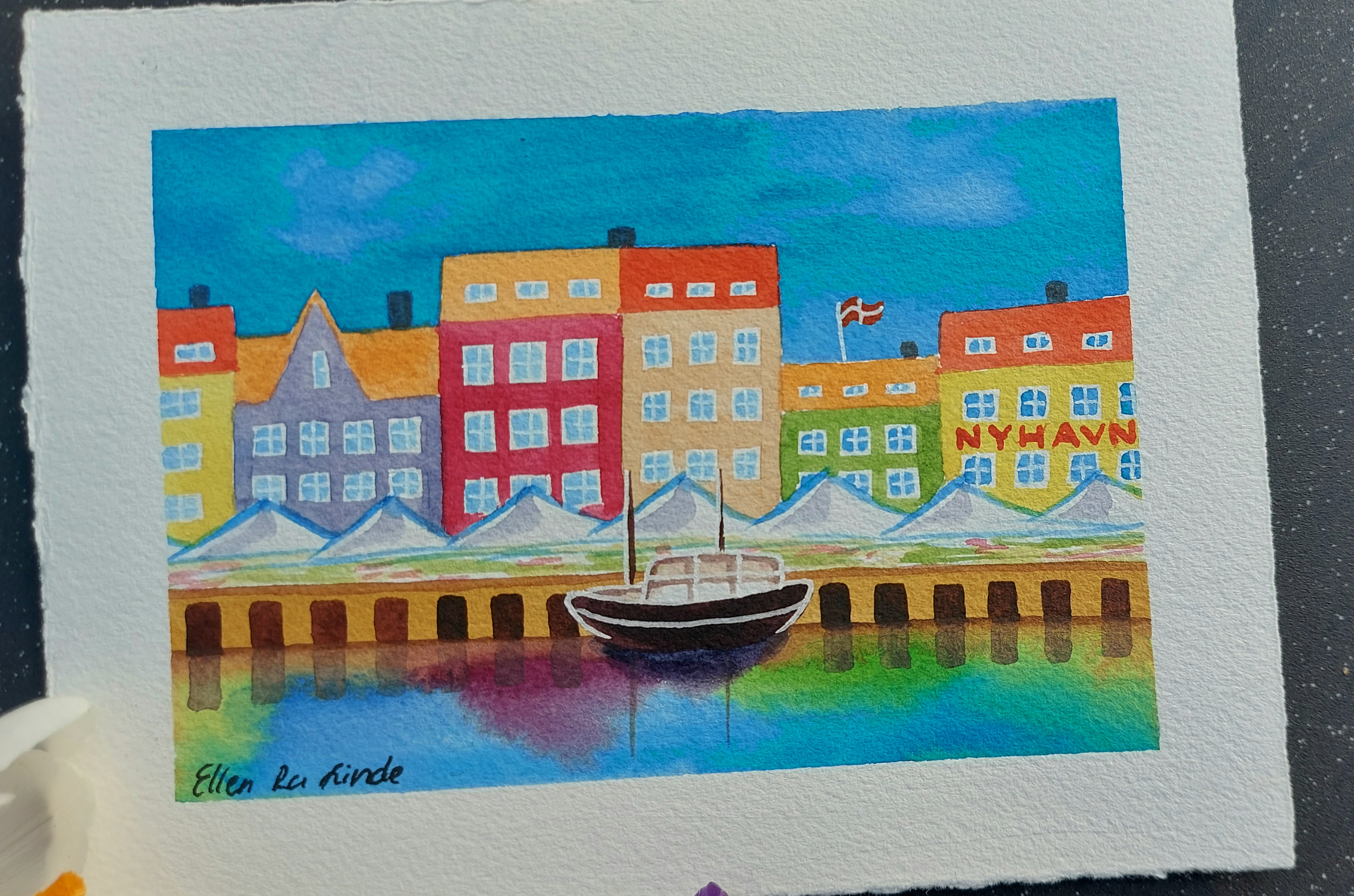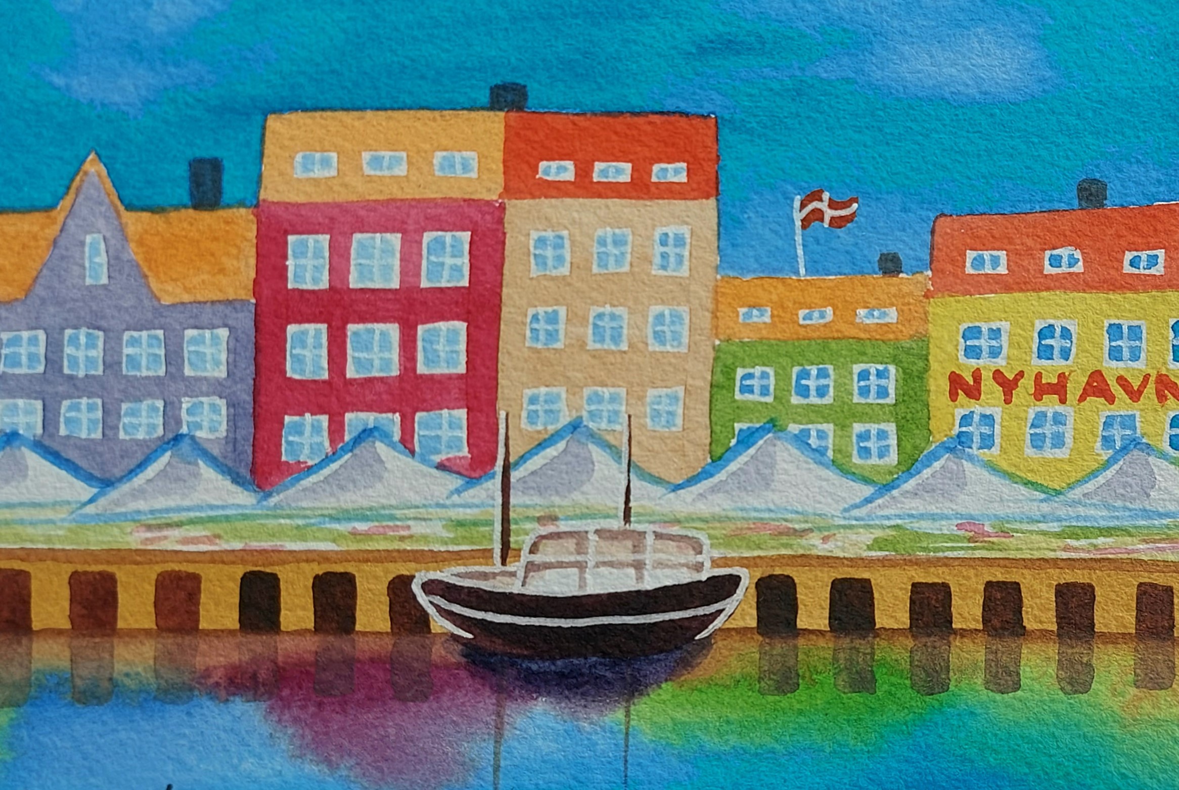 Mini watercolour drawing painted from real-life, picturing Nyhavn, København. The buildings pictured in the artwork are imitations of the real buildings there, most being over 100 years old. The lavender-coloured house to the left was the home of the famous Danish writer H.C.Andersen.