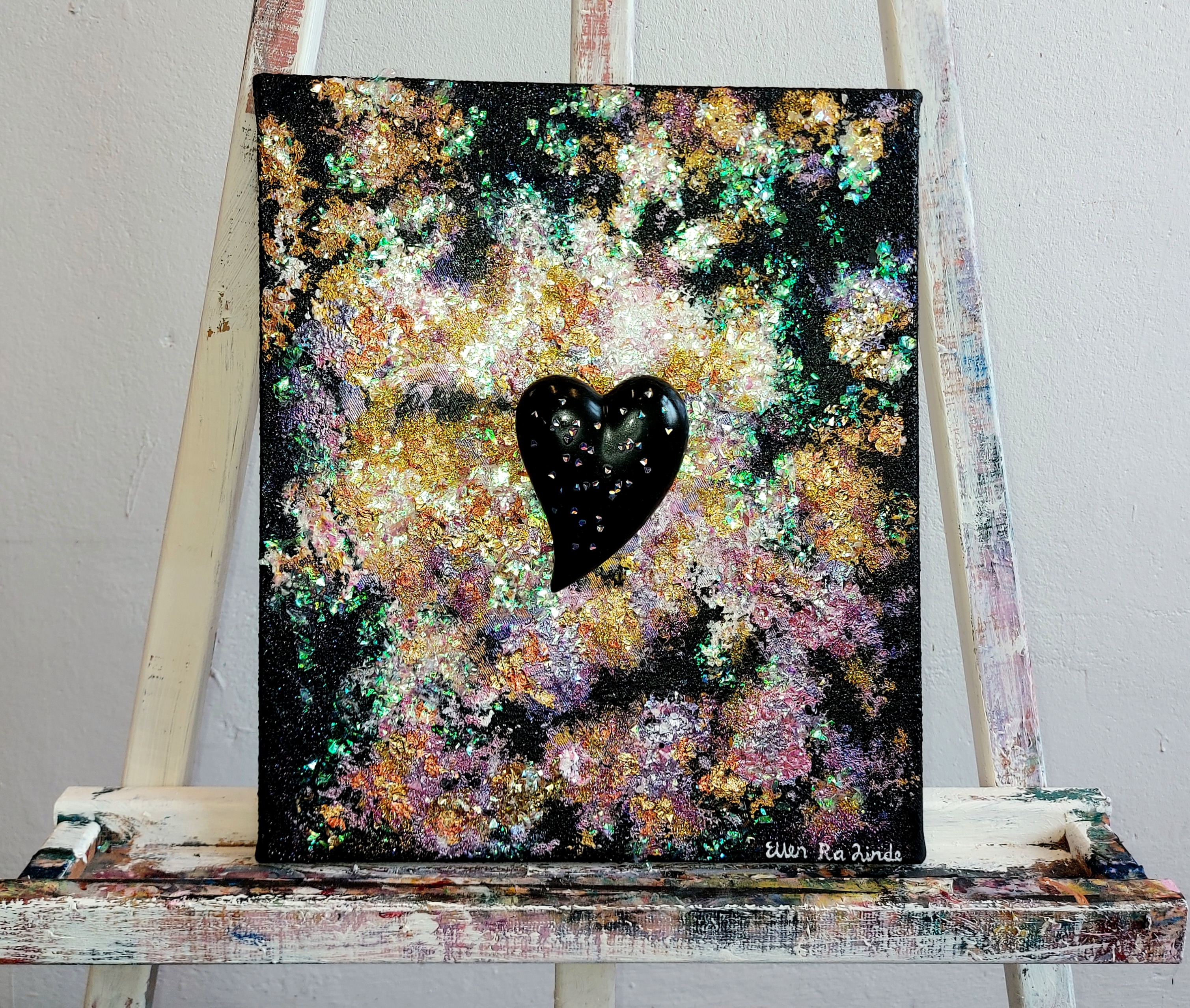 The 3-Dimensional heart is shiny & black, decorated with small diamond-like stones, representing the stars in the black Universe, which in turn is already in our hearts, connecting us together with the universe.