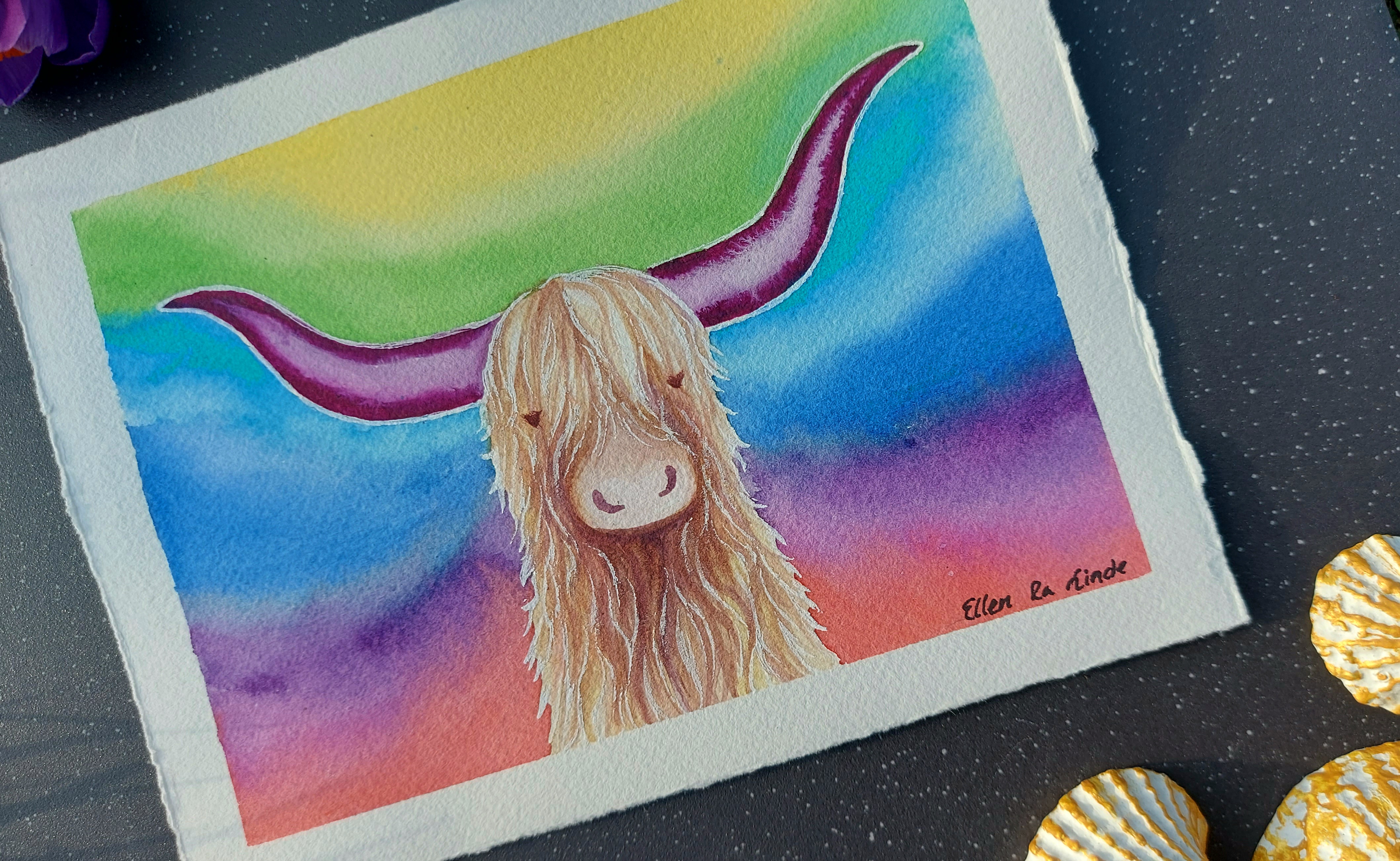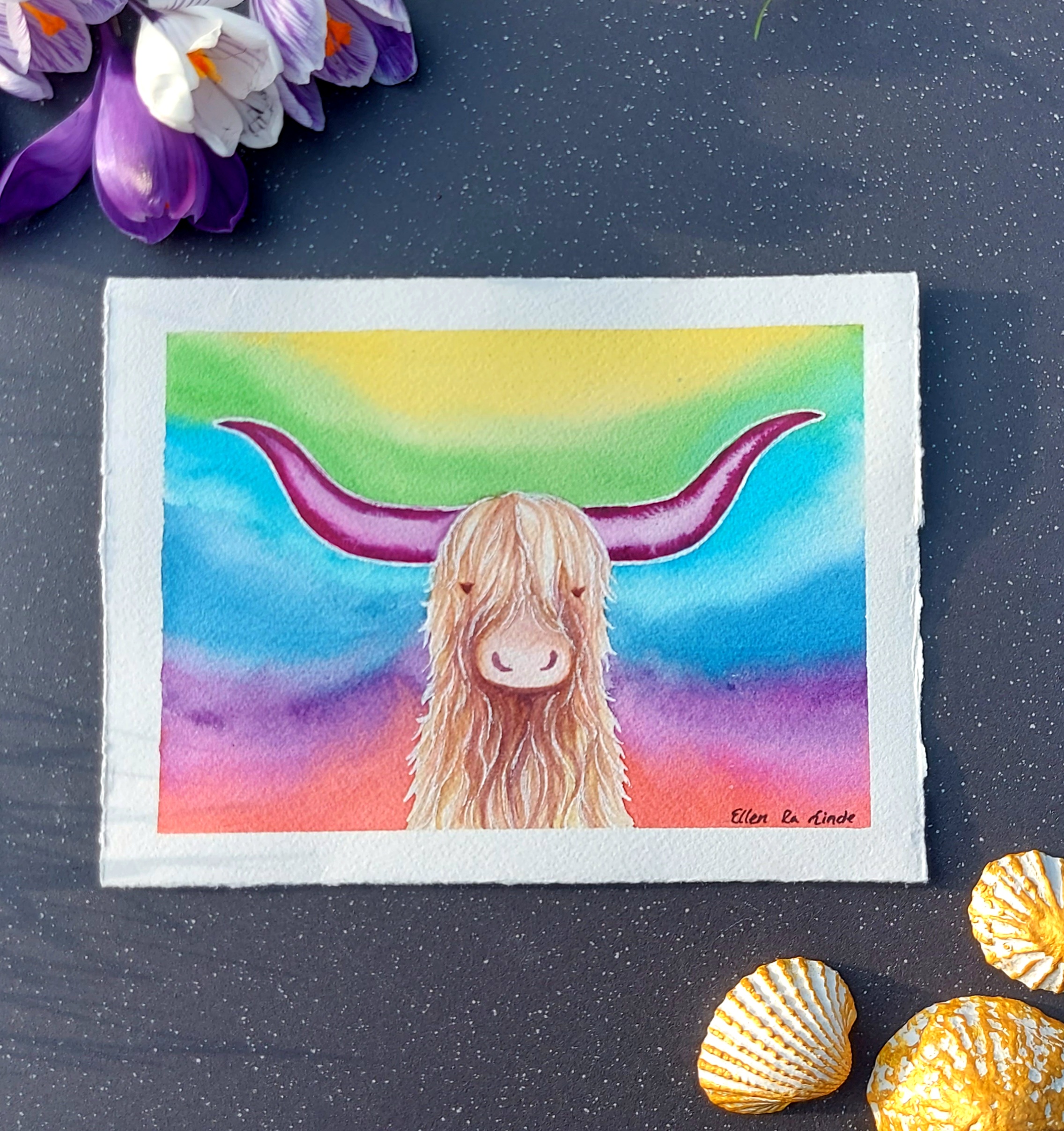 This cute little rainbow cow is a mini painting in aquarelle on fine art paper. An original artwork created by Ellen (Ra Linde) the summer of 2022, in celebration to the big Pride festival that takes place in Berlin every summer.